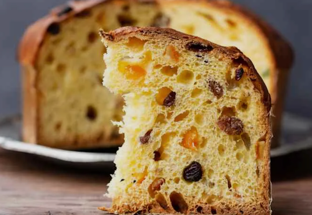Traditional Italian Christmas panettone with raisins and candied orange peel