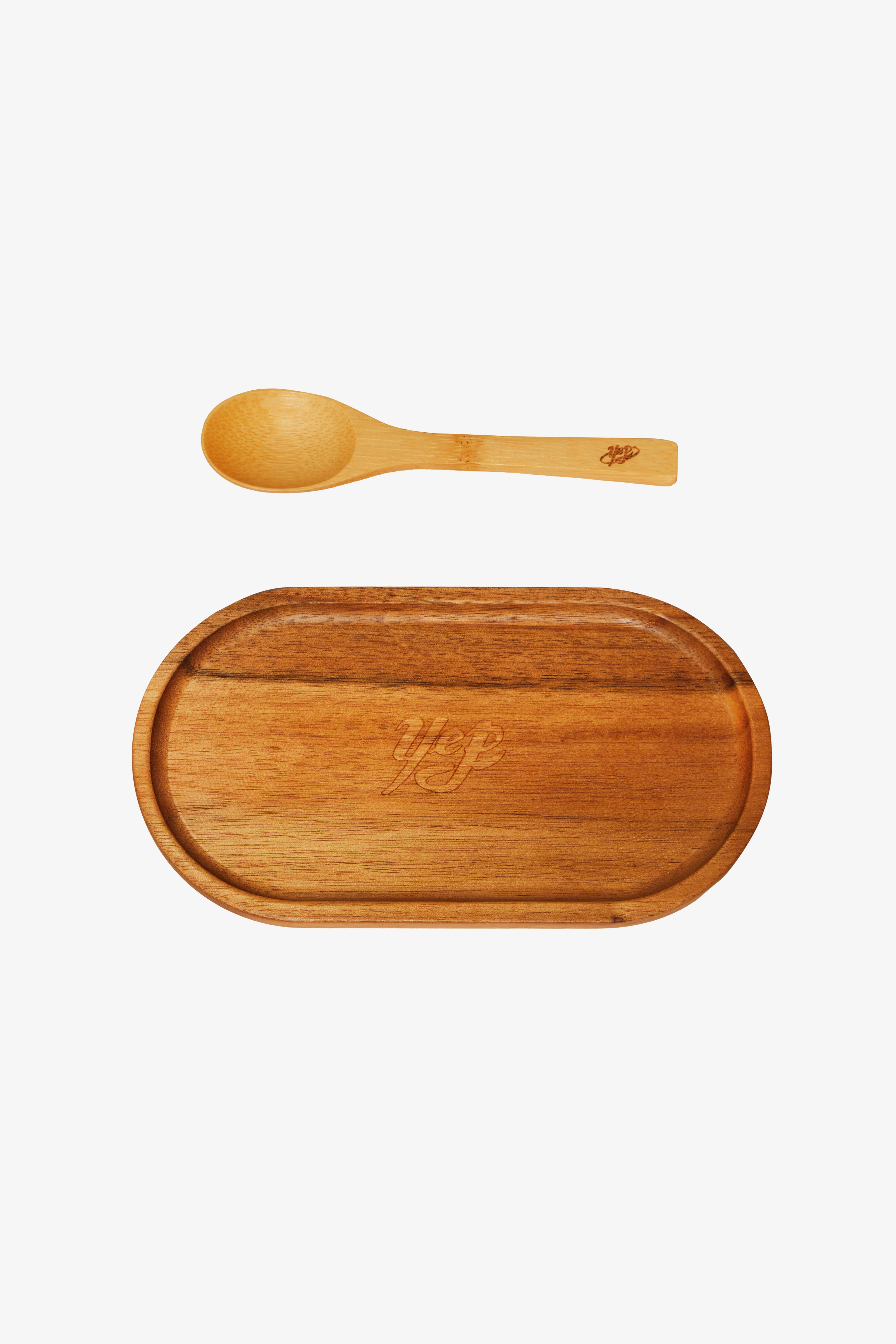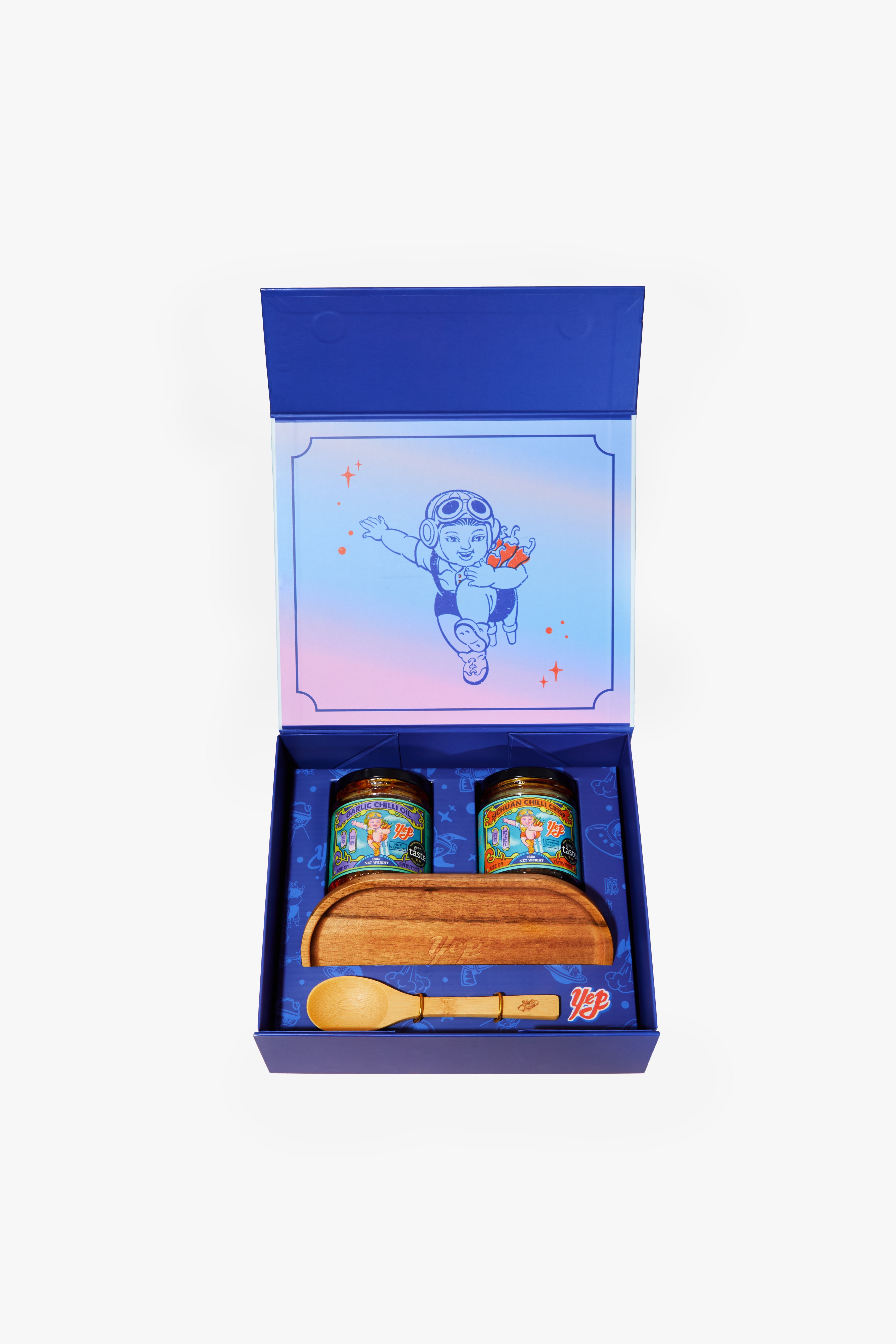 Yep' Kitchen's two best selling and award-winning chilli oils with a natural acacia wooden serving tray and handmade recycled bamboo spoon.