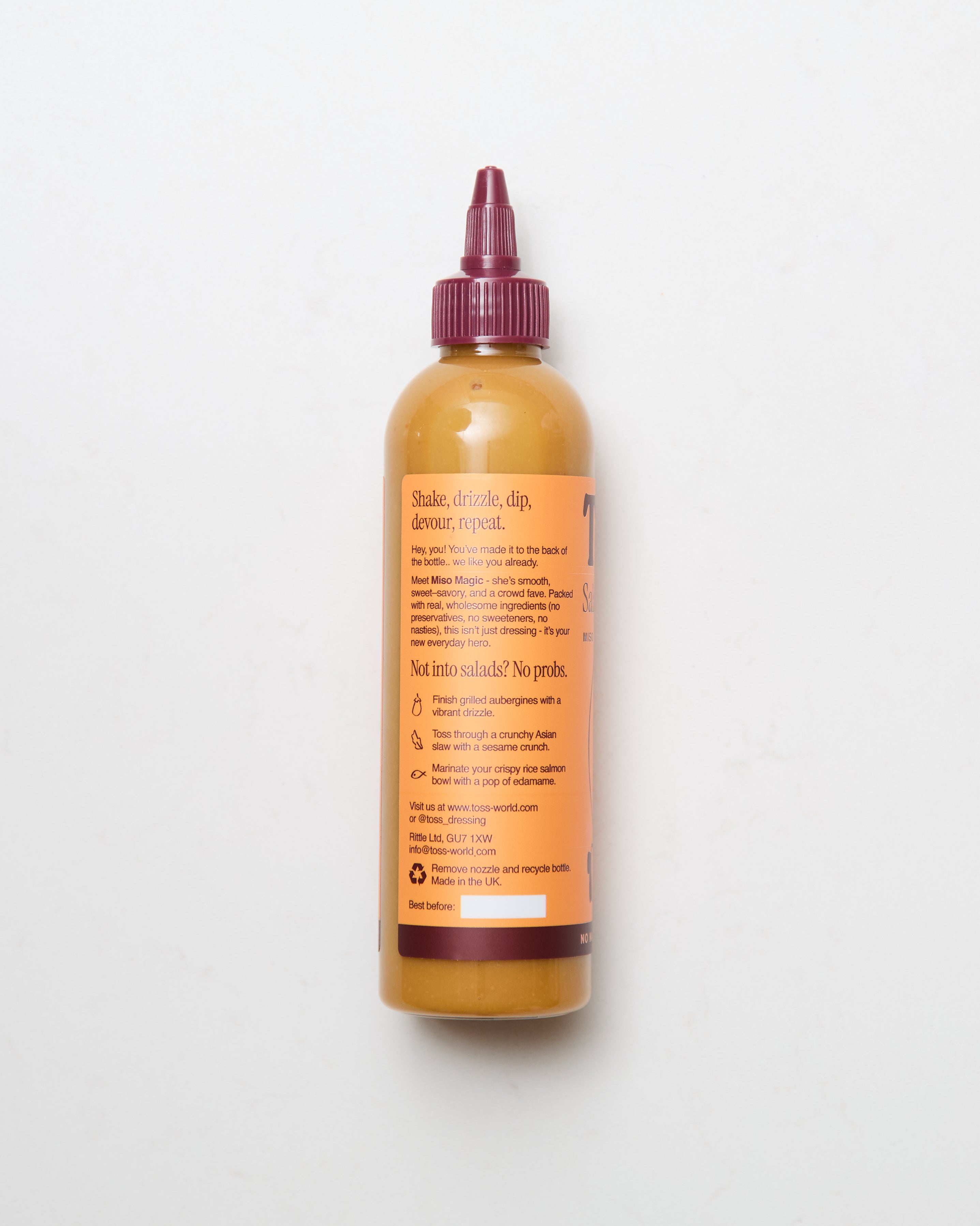 Ingredients: Miso (26%) (Water, Soybeans, Rice, Salt, Alcohol (Ethanol)), Extra Virgin Rapeseed Oil, Lime Juice, Maple Syrup, Rice Vinegar, White Wine Vinegar, Tamari Soy Sauce (Water, Soybeans, Salt, Spirit Vinegar), Tahini (Sesame), Sesame Oil