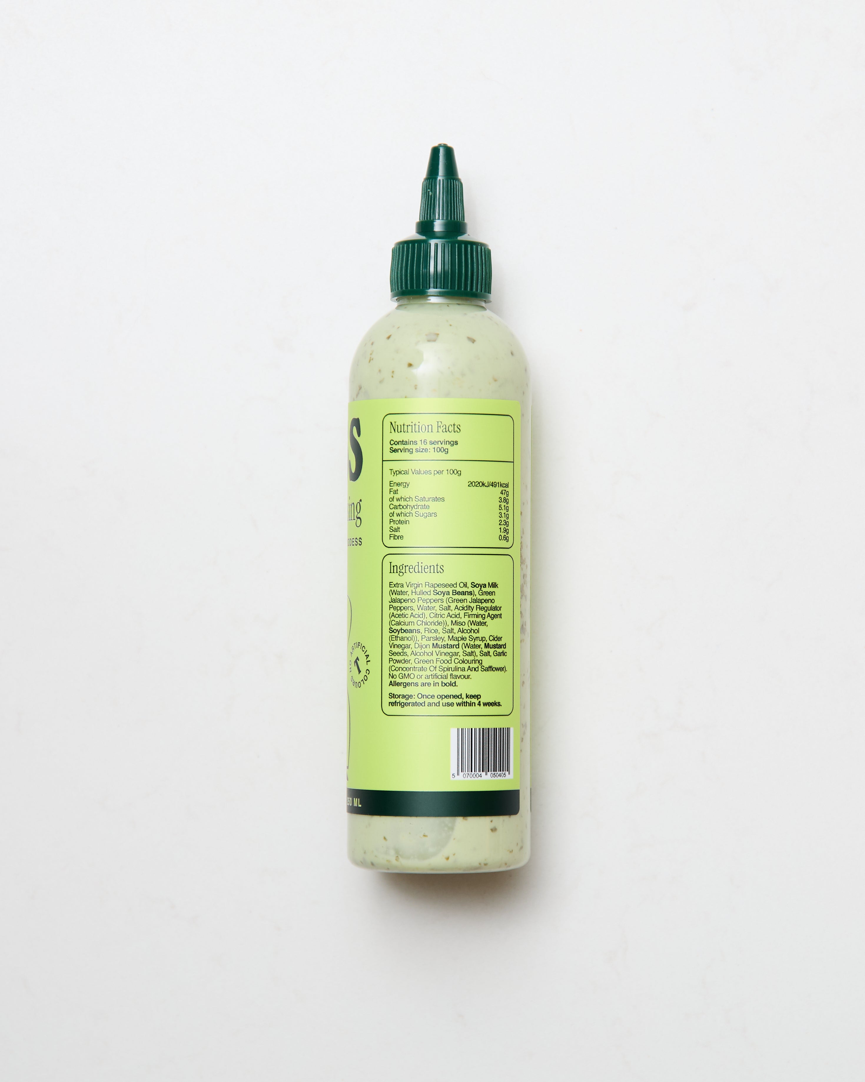 Ingredients: Extra Virgin Rapeseed Oil, Soya Milk (Water, Hulled Soya Beans), Green Jalapeno Peppers (Green Jalapeno Peppers, Water, Salt, Acidity Regulator (Acetic Acid), CitricAcid, Firming Agent (Calcium Chloride)), Miso (Water, Soybeans, Rice, Salt, Alcohol