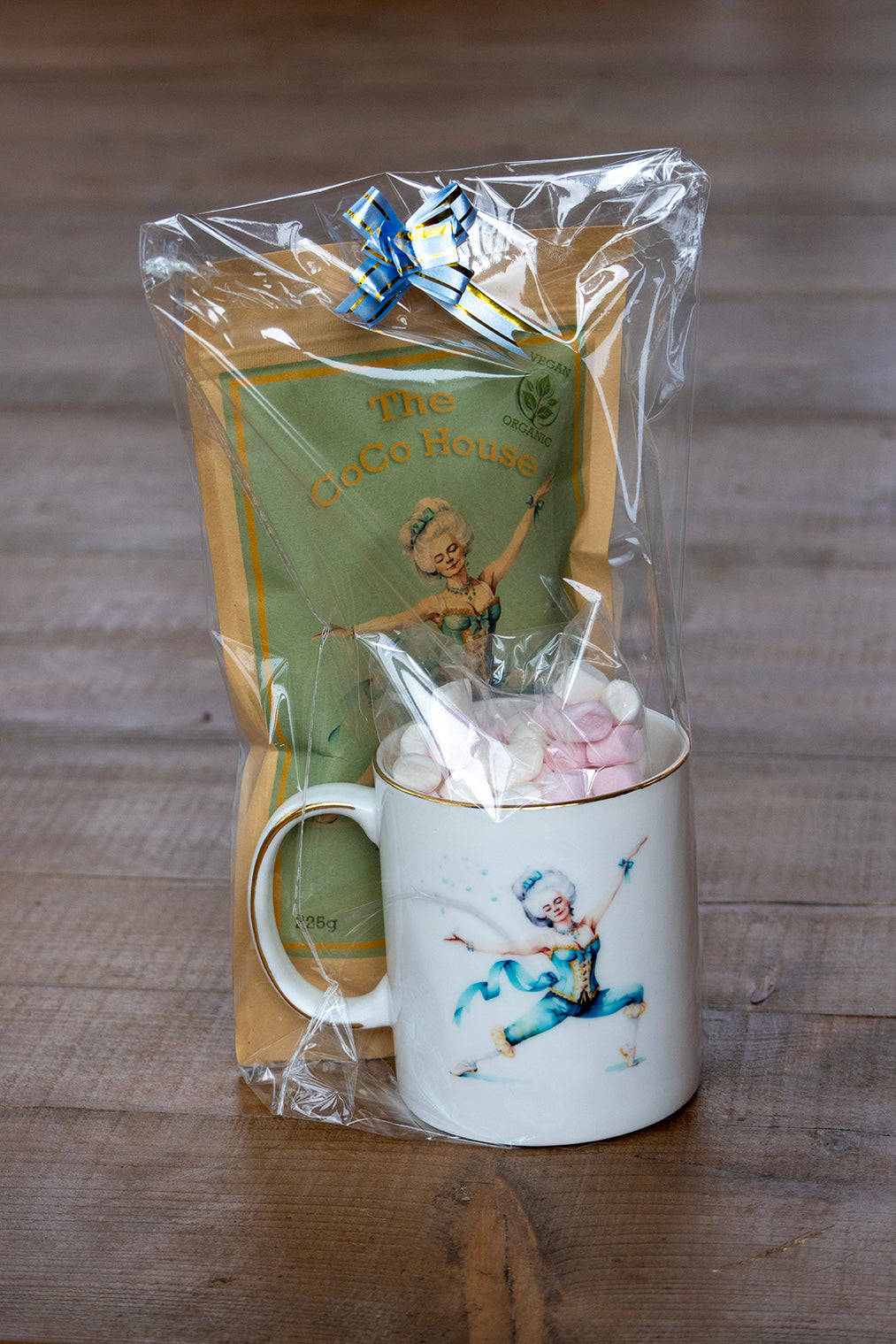 This gift set is the perfect gift for those who like cocoa, it is a bag of 100% organic cocoa to be used for drinking or baking. The bag is compostable. It accompanies a large gold rimmed bone china mug depicting a vintage image of Marie Antoinette, Queen of France, striking a warrior pose, as 100% cocoa is very good for you! Last but not least the package also includes some mini pink and white marshmallows to sprinkle on top of a hot chocolate or can be used in baking.