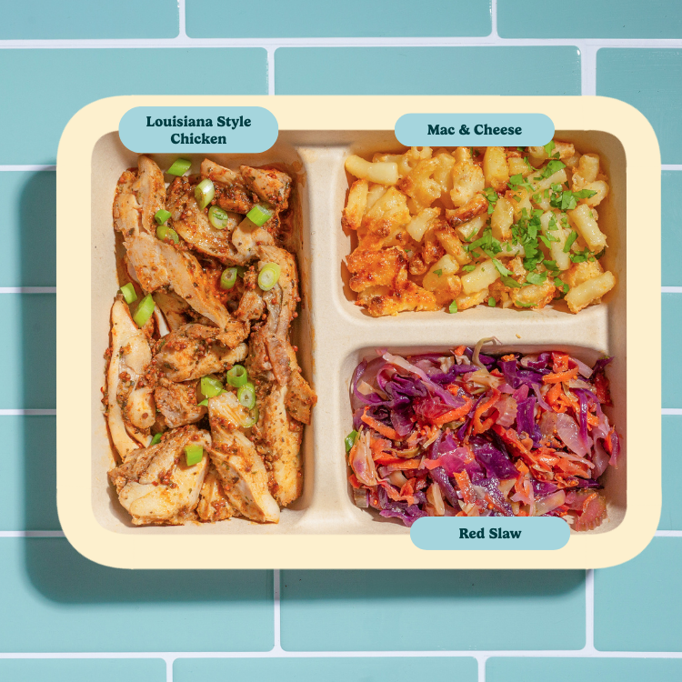 Spiced chicken with a signature Louisiana kick. Served with light mac & cheese and red slaw for bold, Southern flavour.