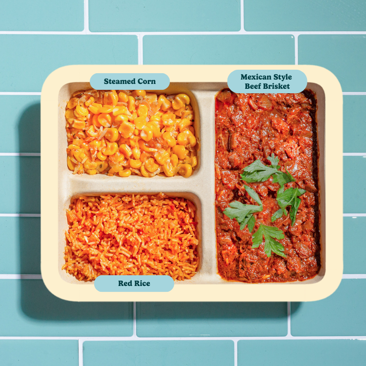 Slow-cooked beef brisket infused with smoky Mexican spices until perfectly tender. Served with steamed corn and red rice for rich, hearty flavour.