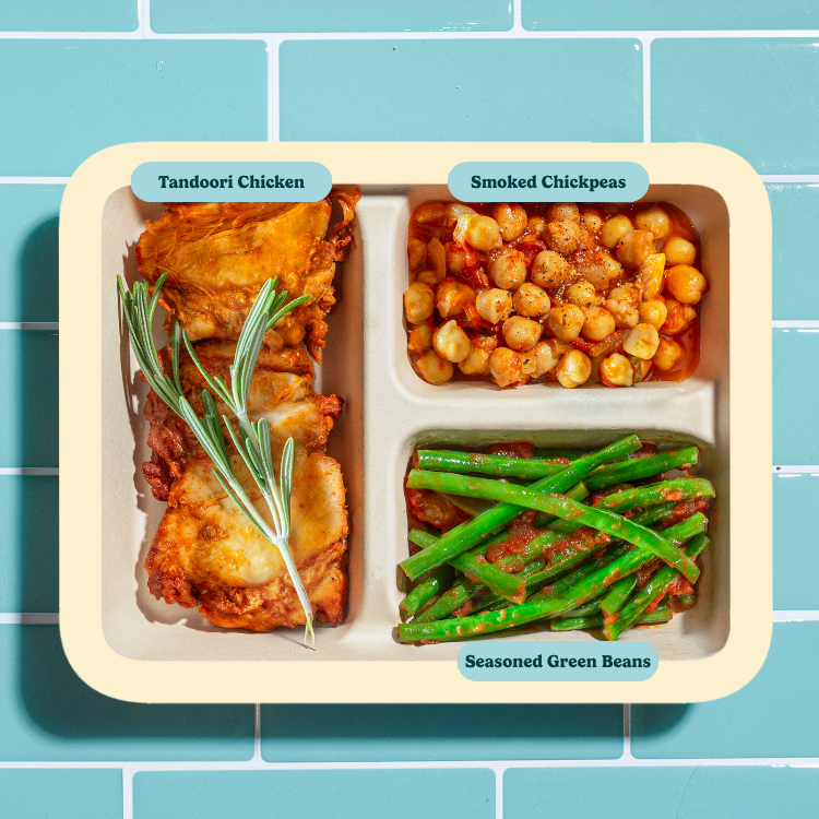 Chargrilled tandoori-spiced chicken thigh, tender and full of flavour. Served with seasoned green beans and smoky chickpeas for a protein-rich, wholesome take on an Indian classic.