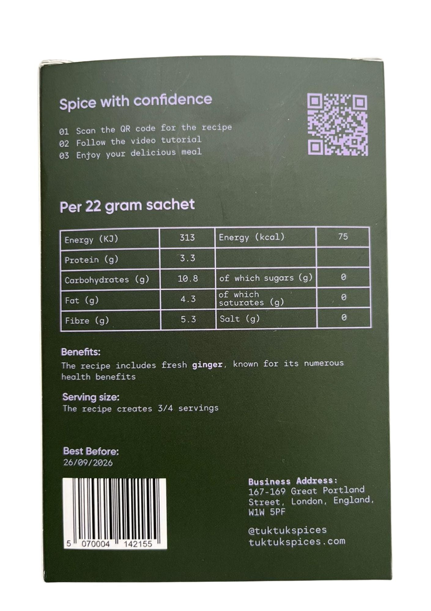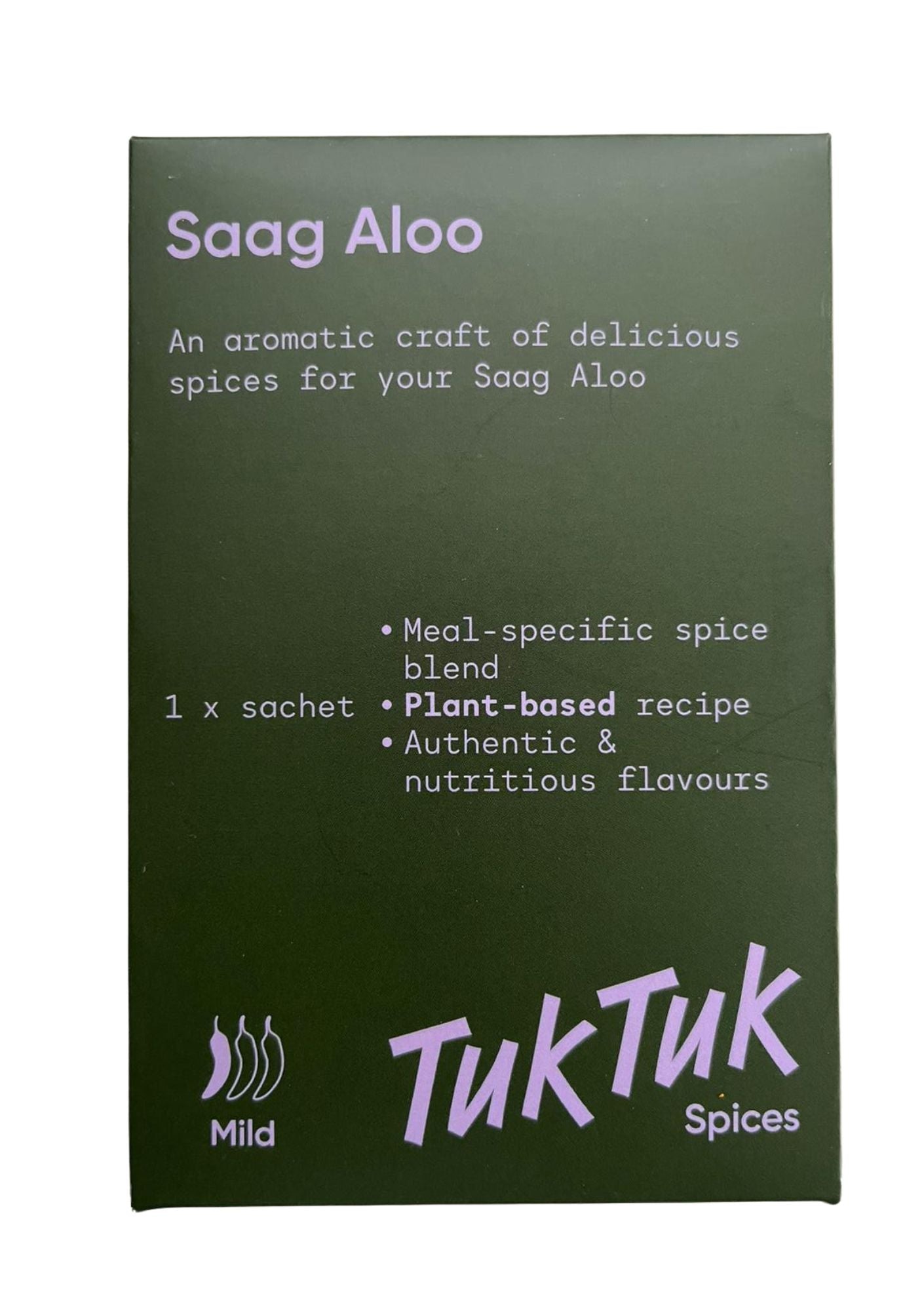 Create a vibrant homemade Saag Aloo with ease. Tuk Tuk's Saag Aloo Spice Sachet contains a perfectly balanced blend of spices measured to the ideal quantity, giving you authentic flavour without the guesswork.